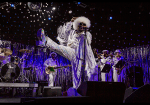 In Holidelic, Bradley brings to life the role of Papadelic, funk’s Father Christmas, a combo of George Clinton and a soulful Santa. He weaves this psychedelic holiday tale with humor, heart, and booty shakin’ grooves played by a P-funk clad band of top shelf misfits that Papadelic affectionately calls dysFUNKtional. The setting is the best of Bradley’s favorite 2 worlds: theatre with a dance groove. And after 20 years, Bradley has perfected his funk holiday magic into a Christmas classic.