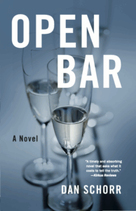 Dan Schorr: I grew up with a mother who was a high school English teacher and gave me a love of novels at a young age, then I majored in English in college with a dream of being a writer. I was constantly exposed to great books and others who loved reading. After law school, I became a sex crimes prosecutor, and my current non-writing work involves numerous campus sexual misconduct investigations. Based on these experiences, for Open Bar I was interested in writing about some of the real-world, problematic situations occurring at colleges and universities around the country, especially large-scale sexual misconduct scandals and how educational institutions, corporations, and government officials respond to them in less-than-ideal ways which don’t best serve sexual abuse survivors.