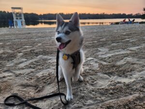 His breed is a mix of Husky & Spitz, but the AKK became recognized as its own breed in the 1990s. Bucky loves pool water but prefers to enjoy lakes from the shore. His nemesis is a rabbit, dubbed “Bunnicula”, who eats the flowers outside of Bucky’s front-of-house “perch” (which is really just some blankets on top of a couch by the window). He spends most of his days up there, looking out at the “exciting action” on our very quiet, very non-exciting block.