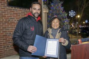 Mayor Marjorie Hsu presents a proclamation to Sleepy Hollow Football Coach Anthony Giuliano in recognition of the team’s memorable season, which took the Horsemen deep into the post season and generated intense community pride and support. Photo: Margaret Fox