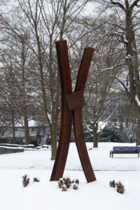 Farther to the left, you come upon a two-part memorial to 9/11. A small rectangular stone with a bronze plaque depicting the Manhattan skyline was dedicated on the one-year anniversary and reads in part: “May this memorial serve as a symbol of honor for all those who put themselves in harm’s way – firefighters, police officers, emergency personnel, and brave Americans alike.” A second monument nearby features a dramatic installation of remnants from the World Trade Center.