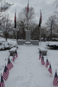 You notice these first: the two stone benches, three tall flag poles with the large red, white, and blue American flags flanked by the black Prisoners of War (POW) and Missing in Action (MIA) flags, and a stone pathway with smaller American flags leading to the imposing World War II monument. Above the names of several of the veterans, the inscription reads: “Glory to them that died in this great cause. In grateful memory of the men and women of the Tarrytowns who served in World War II.”