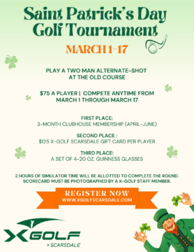 Grab a partner and take on the Old Course in this two man alternate shot challenge at X Golf Scarsdale. Compete anytime between March 1 and March 17 for your chance to win exclusive prizes. All skill levels welcome. Limited simulator time available, so book early.Grab a partner and take on the Old Course in this two man alternate shot challenge at X Golf Scarsdale. Compete anytime between March 1 and March 17 for your chance to win exclusive prizes. All skill levels welcome!