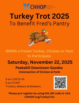 Join the 2025 Turkey Trot To Benefit Fred's Pantry! Walk, trot, or roll through downtown Peekskill to support local families this Thanksgiving! To participate, bring a frozen turkey, chicken, or ham. The event takes place Saturday, November 22, 2025, at the Peekskill Downtown Gazebo (Intersection of Division & Park). Check-in begins at 8:00 AM, and […]