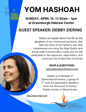 All are invited to the Greenburgh Hebrew Center in Dobbs Ferry to meet and hear Debby Ziering speak about her life as the daughter of 2 Holocaust survivors. Debby will tell the story of her father, who was born in Germany and was sent to the Riga Ghetto in Latvia and then Kaiserwald concentration camp. […]