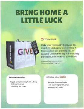Throughout November, when you purchase a reusable Community Bag for $2.50 at the Stop & Shop located at 246 South Highland Avenue, $1 will be donated to Friends of the Ossining Public Library . Community Bags will be found on display racks. We have received over $500 through this program’s past sponsorships. This store also […]